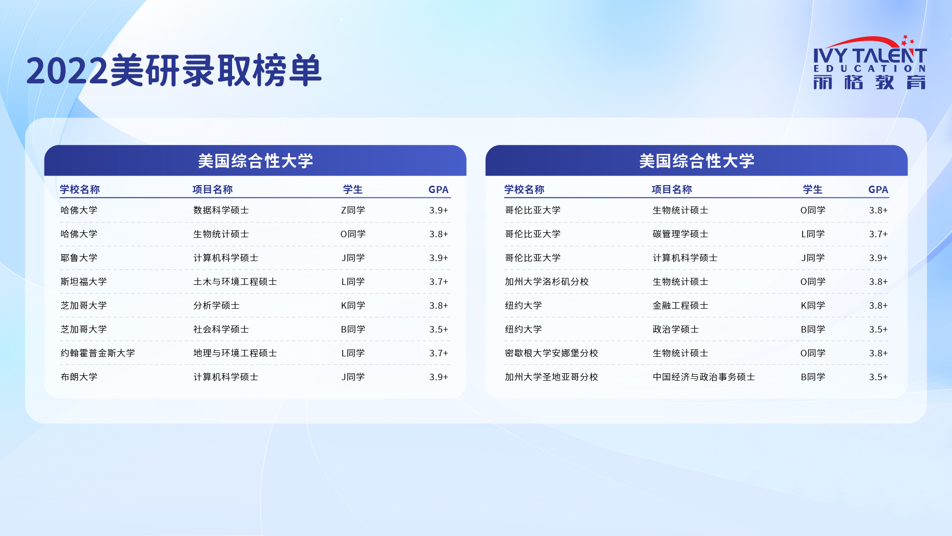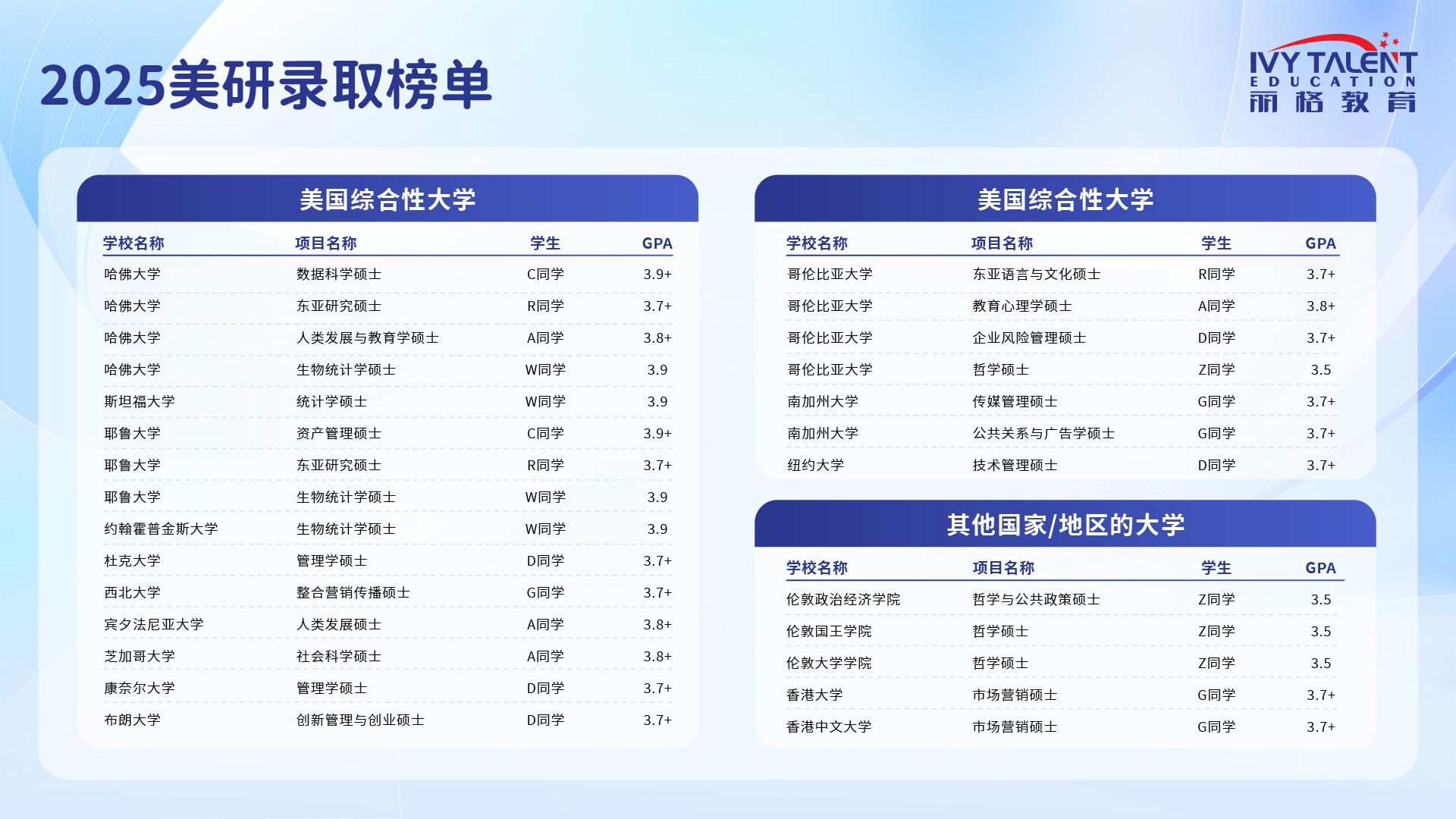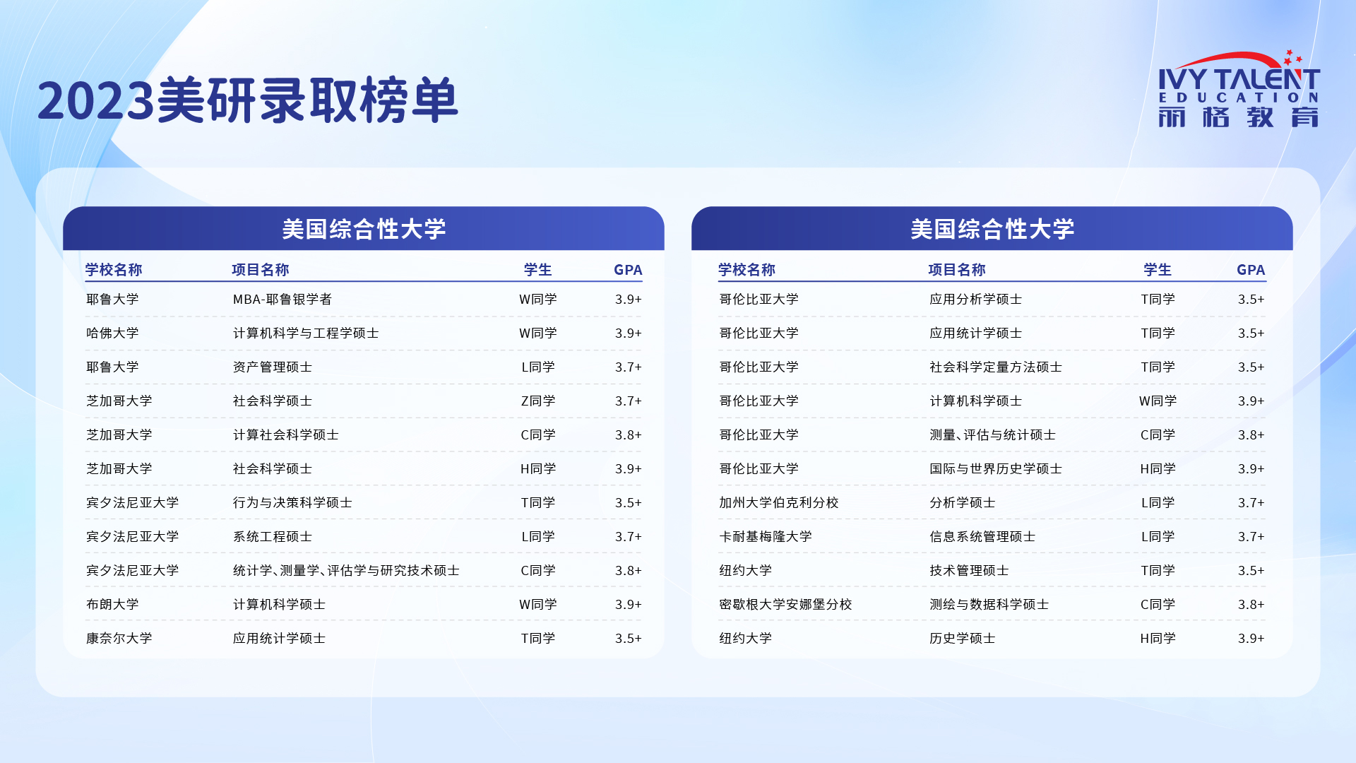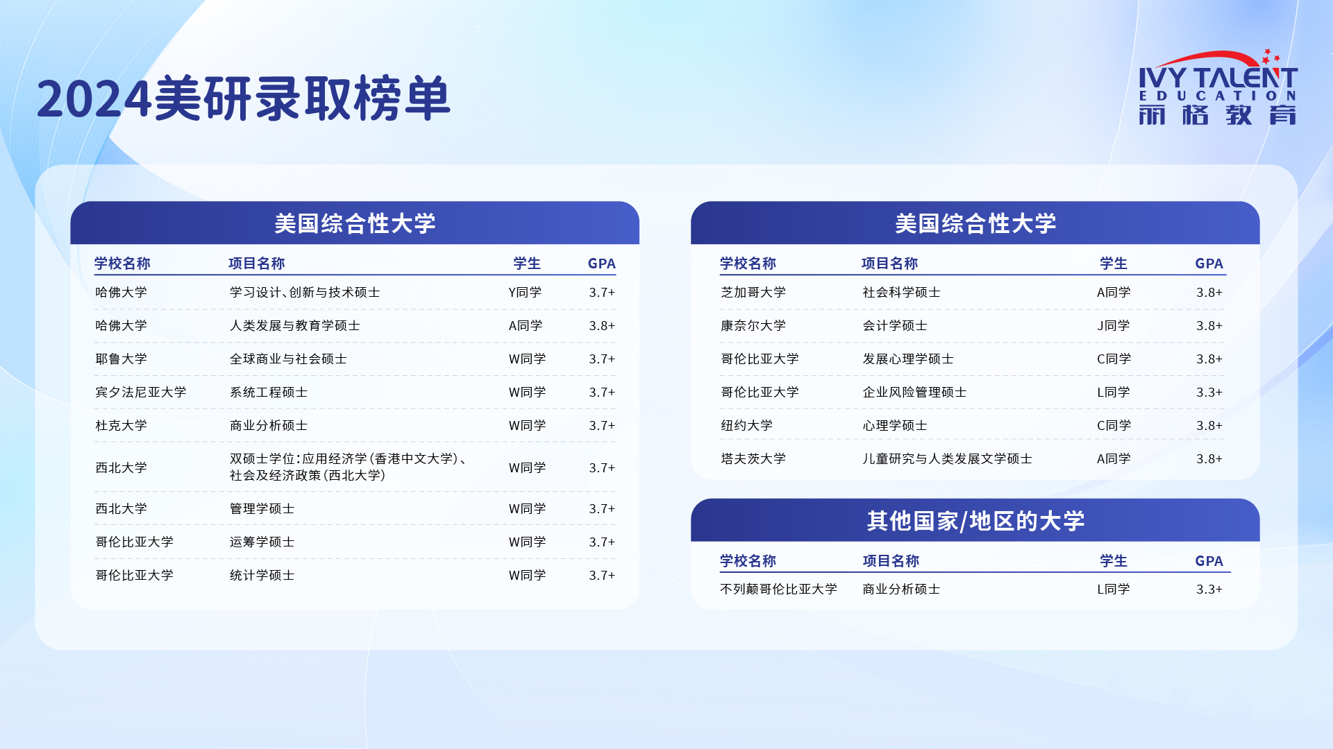自2013年以来,丽格教育始终专注于为全球学生提供权威的研究生申请规划服务。凭借专业指导与个性化策略,我们的学生已成功获得众多美国顶尖硕士项目的录取。